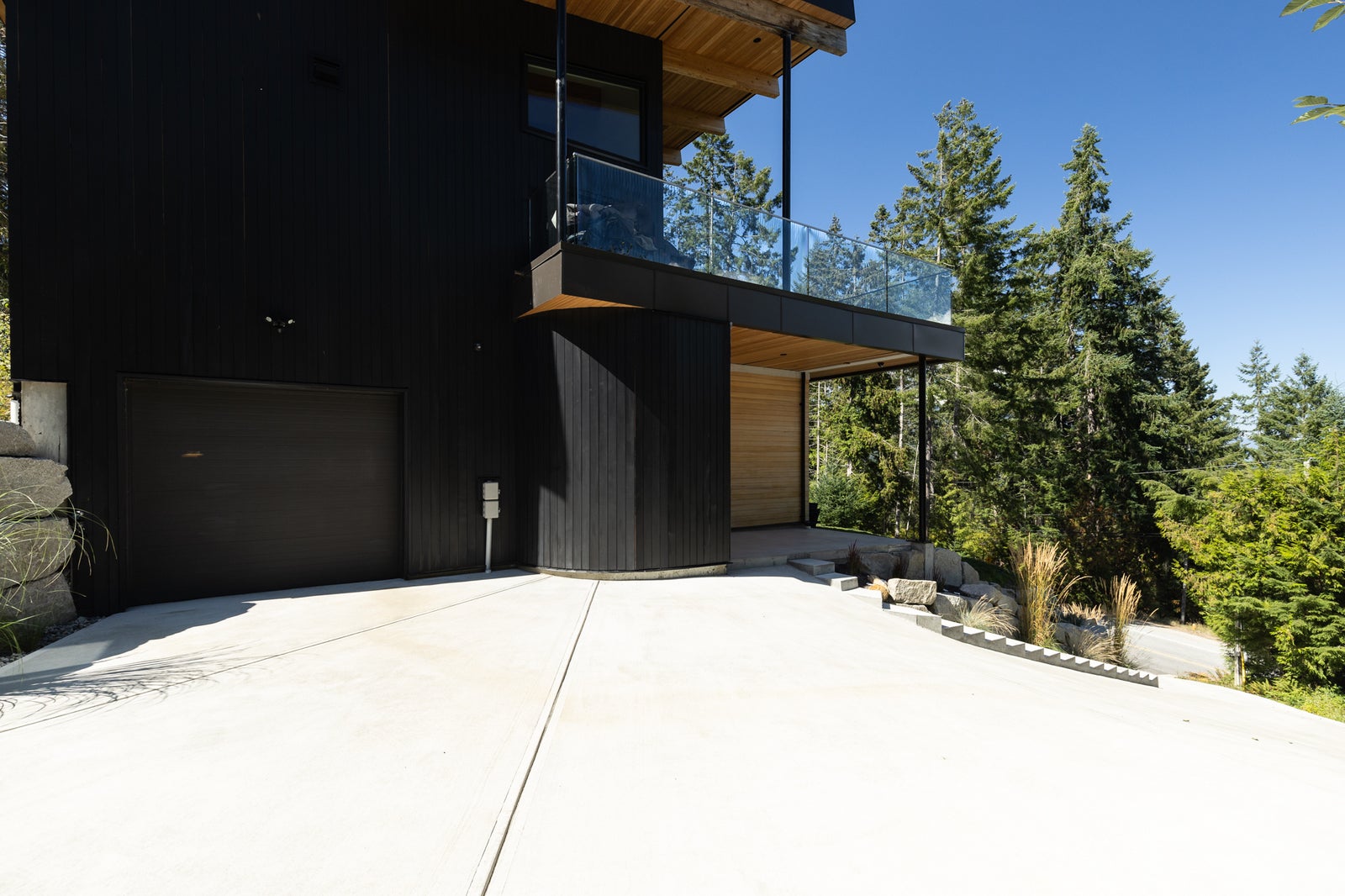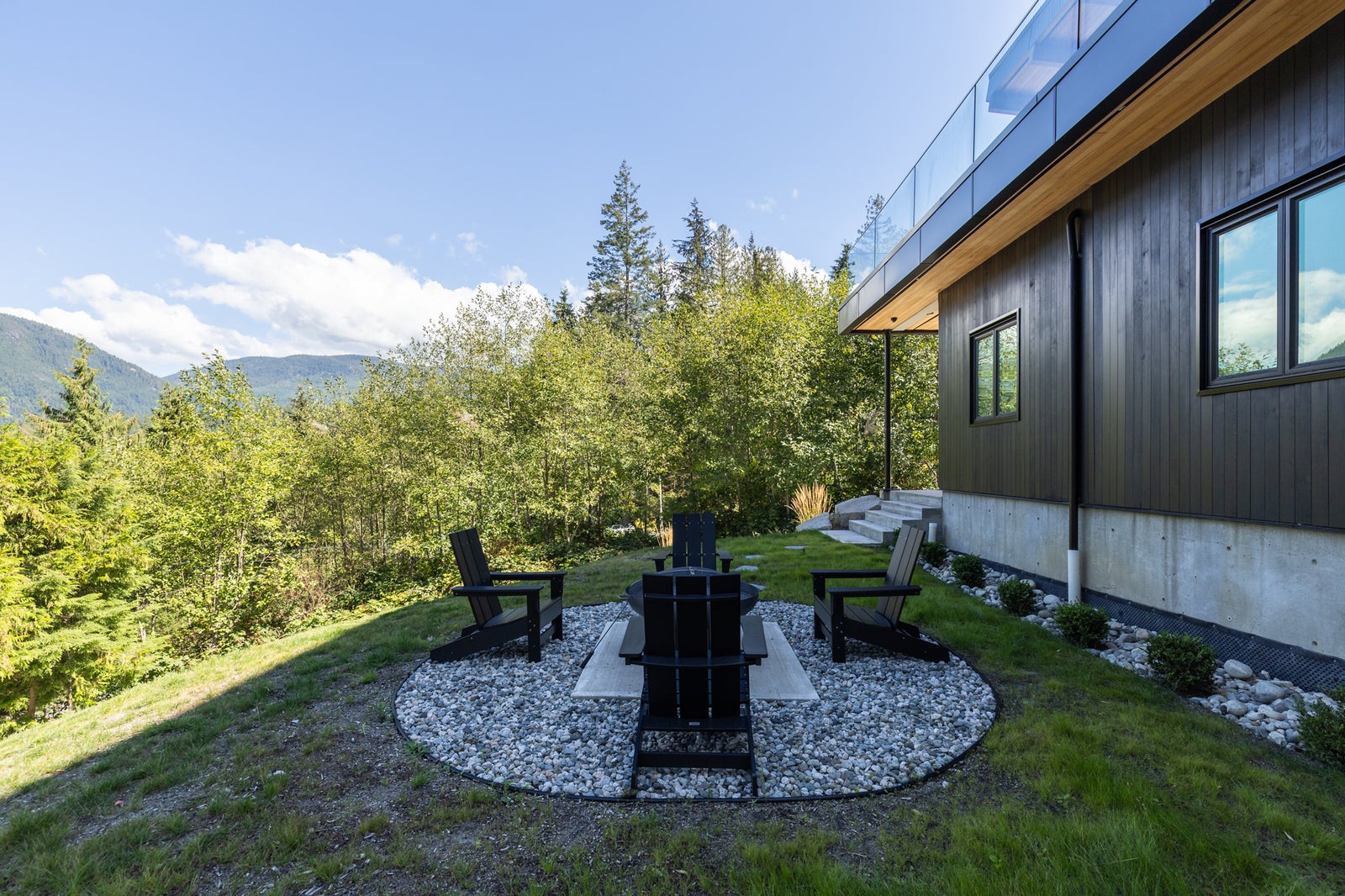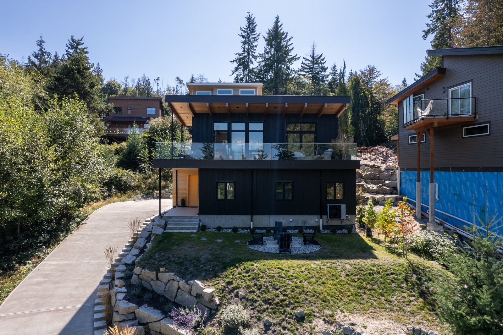 With its modern West Coast façade—black vertical siding, warm fir accents, and a bold sheltered entry—the home makes a statement from the moment you arrive. A private lower firepit area offers another peaceful space to enjoy ocean air, forest views, and quiet evenings.
