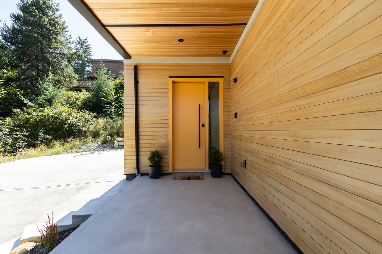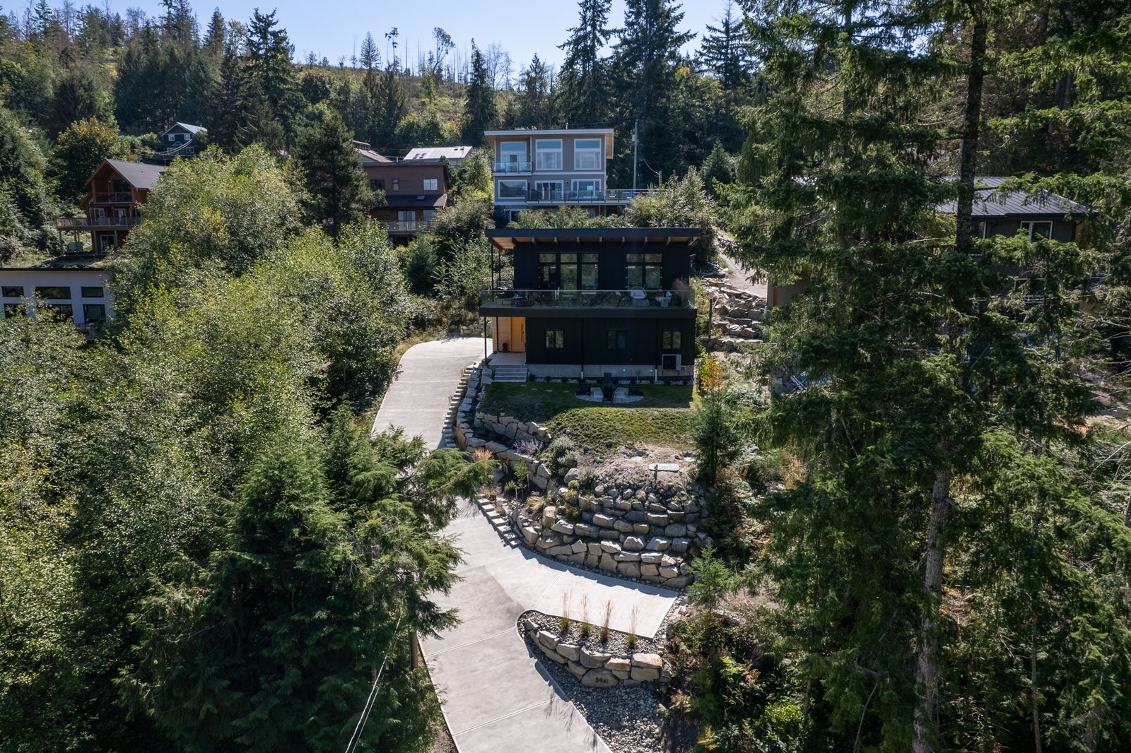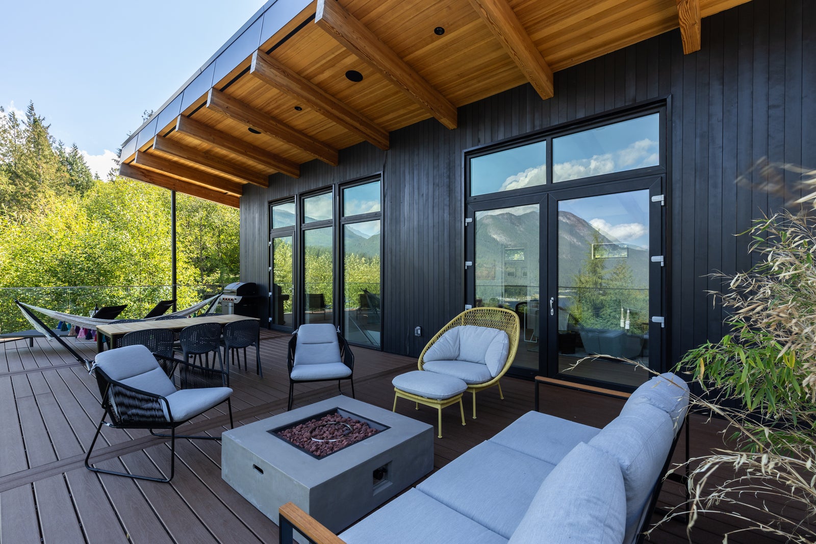 With its modern West Coast façade—black vertical siding, warm fir accents, and a bold sheltered entry—the home makes a statement from the moment you arrive. A private lower firepit area offers another peaceful space to enjoy ocean air, forest views, and quiet evenings.